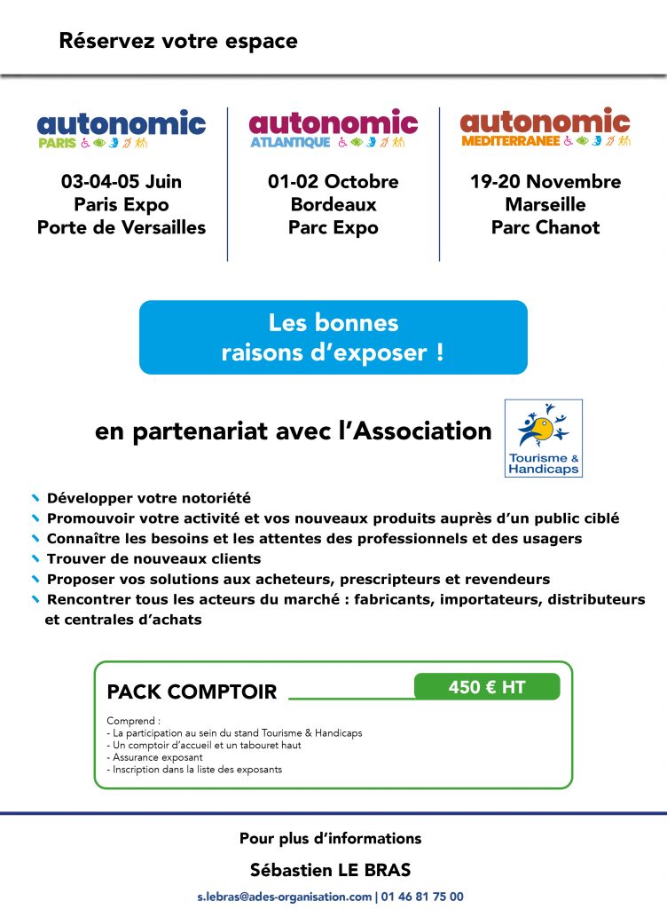 Comme vous le savez, l’Association Tourisme & Handicaps est partenaire des salons du tourisme (Lille-Lyon et Paris) et des salons AUTONOMIC.