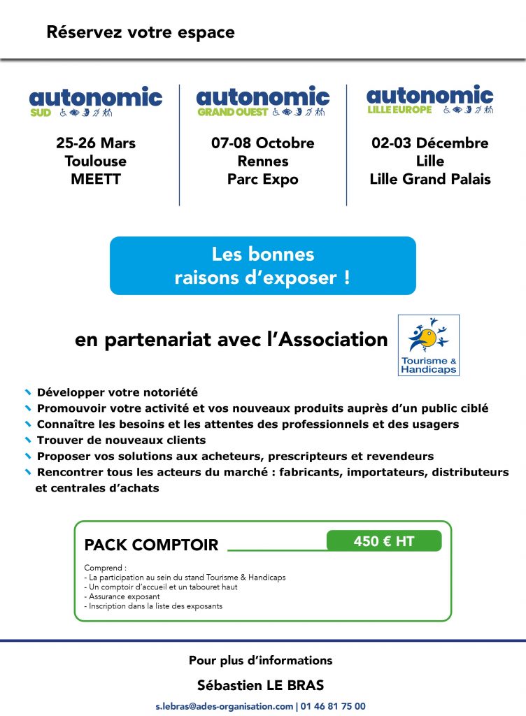 Comme vous le savez, l’Association Tourisme & Handicaps est partenaire des salons du tourisme (Salon Mondial du Tourisme – Destinations Nature – Paris) et des salons AUTONOMIC.